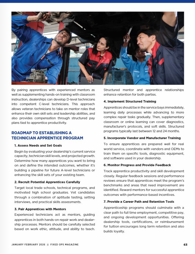 As competition for technicians intensifies, in-house apprenticeship programs provide a cost-effective and sustainable solution. Investing in your own talent ensures that your service department thrives and positions your dealership for long-term success.