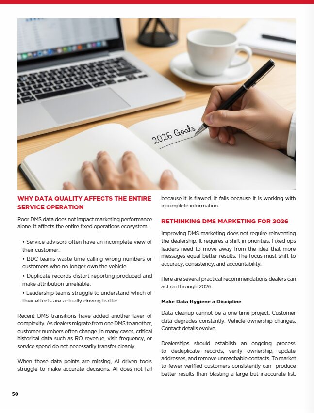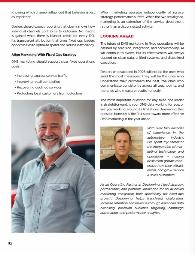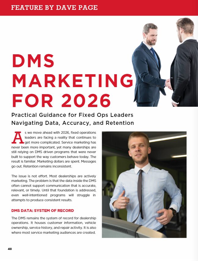 The future of DMS marketing in fixed operations will be defined by precision and accountability. AI and automation will continue to evolve, but their effectiveness will always depend on data quality and process discipline.