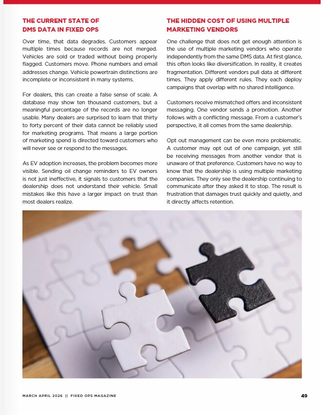 As we look ahead to 2026, fixed operations leaders face a familiar challenge that continues to grow more complex. Service marketing has become more important than ever, yet many dealerships are still relying on DMS driven programs that were never designed to support modern marketing expectations. The result is wasted spend, missed opportunities, and inconsistent retention.