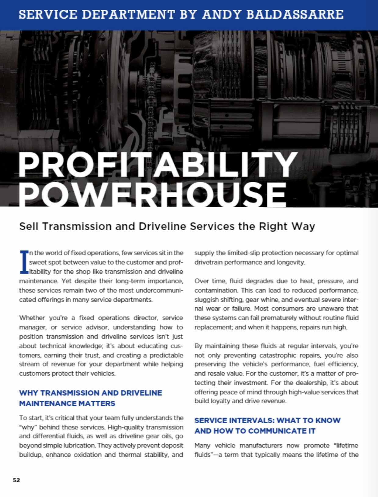 Whether you’re a fixed operations director, service manager, or service advisor, understanding how to position transmission and driveline services isn’t just about technical knowledge; it’s about educating customers, earning their trust, and creating a predictable stream of revenue for your department while helping customers protect their vehicles.