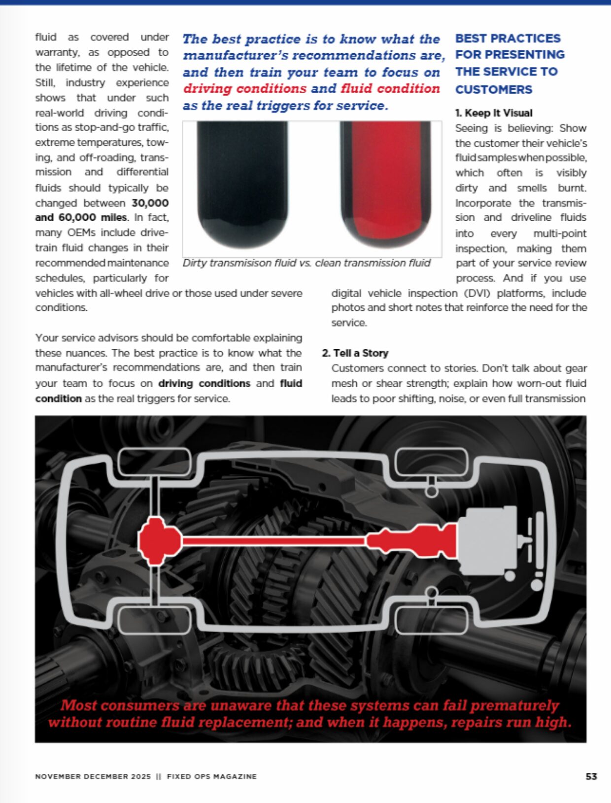 Seeing is believing: Show the customer their vehicle’s fluid as-is—often visibly dirty and smelly. Incorporate transmission and driveline fluids into every multi-point inspection, making them part of your service review process. And if you use digital vehicle inspection (DVI) platforms, include photos and short notes that reinforce the need for the service.